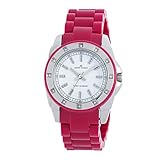 Eine perfekte Kombination aus Sportlichkeit und Eleganz, ist der AK Anne Klein Damen Silber-Tone Swarovski Kristall Akzent Magenta Plastic Uhr eine lustige und ausgefallene Garderobe hinaus. Die 12 klaren Swarovski-Kristallen in einer silberfarbenen Lünette und ein Gehäuse aus Edelstahl fügen Verfeinerung dieser sportlichen Look. Die Magenta Kunststoff-Armband mit Faltschließe ist komfortabel und langlebig. Die weißen Zifferblatt Features Glitter Indexmarker jede Stunde Position und silberfarbenen Zeiger zusammen mit einem schwarzen außerhalb